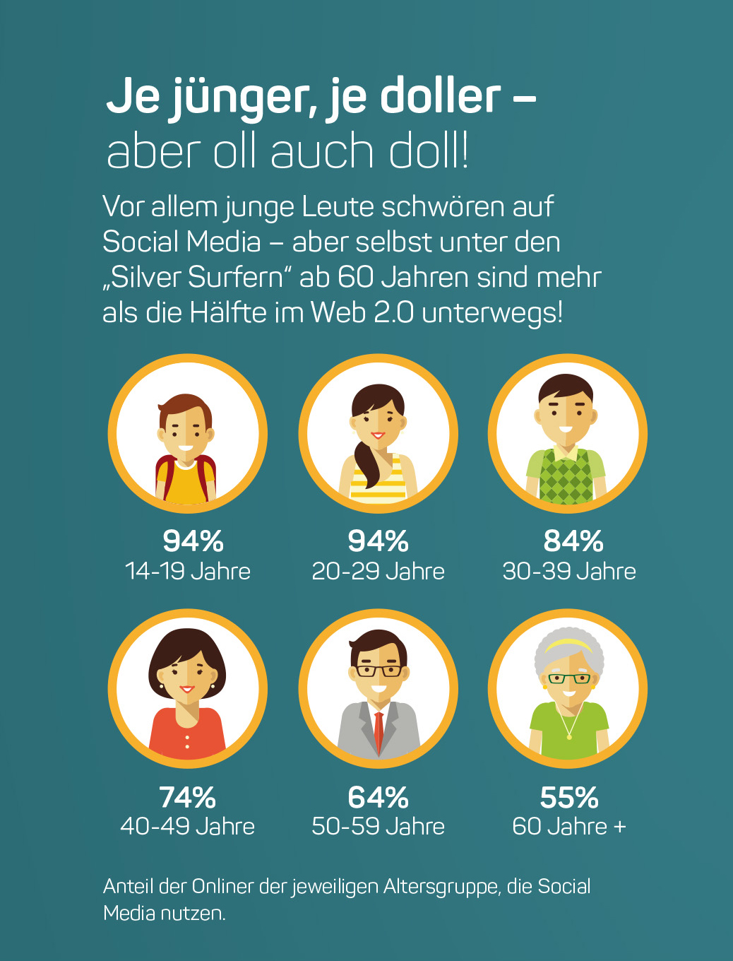 Beruhigend ist, daß sich über die Social Media Kanäle Menschen jeden Alters erreichen lassen. Natürlich stehen die Jüngsten nach wie vor an der Spitze, doch mehr als die Hälfte der über 60-jährigen gaben ebenfalls an, bei Facebook und Co. unterwegs zu sein.