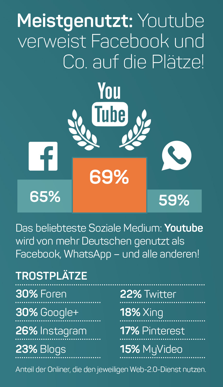 Statistisch betrachtet halten sich die meisten Nutzer bei YouTube auf, was allerdings nicht zugleich dazu verleiten sollte, ausgerechnet hier sein Publikum anzusprechen. YouTube ist schließlich in erster Linie eine Plattform, die mehr auf den einseitigen Filmkonsum ausgerichtet ist, anstatt der Kommunikation zu dienen. Da bleibt Facebook nach wie vor der Platzhirsch.
